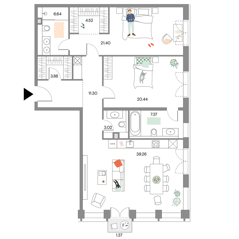 Пример планировки квартиры с 3-мя спальнями и террасой