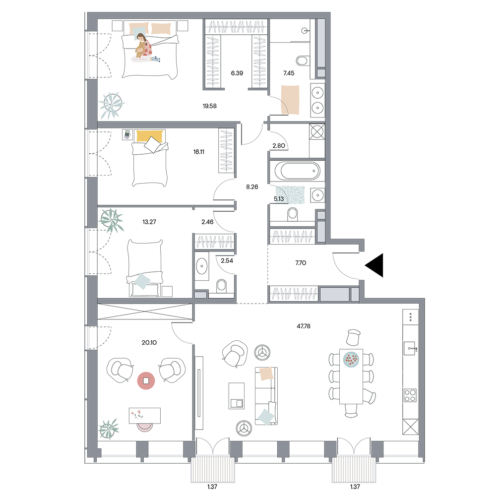 Пример планировки квартиры с 3-мя спальнями и террасой