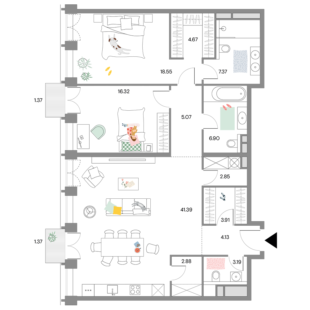 Пример планировки квартиры с 3-мя спальнями и террасой