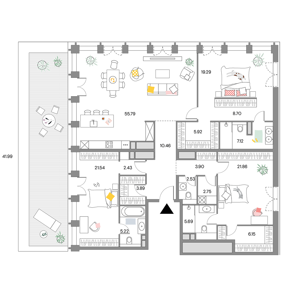 Пример планировки квартиры с 3-мя спальнями и террасой