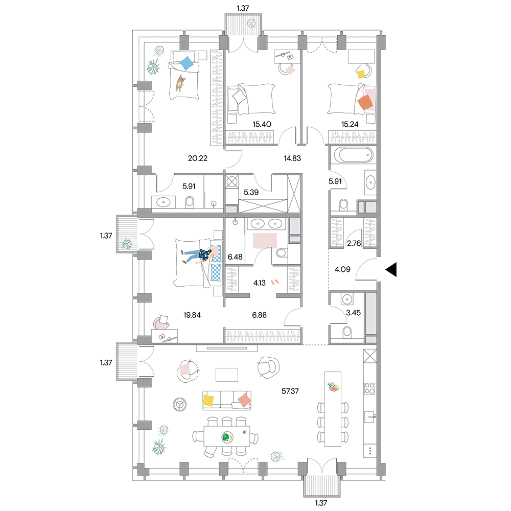 Пример планировки квартиры с 3-мя спальнями и террасой