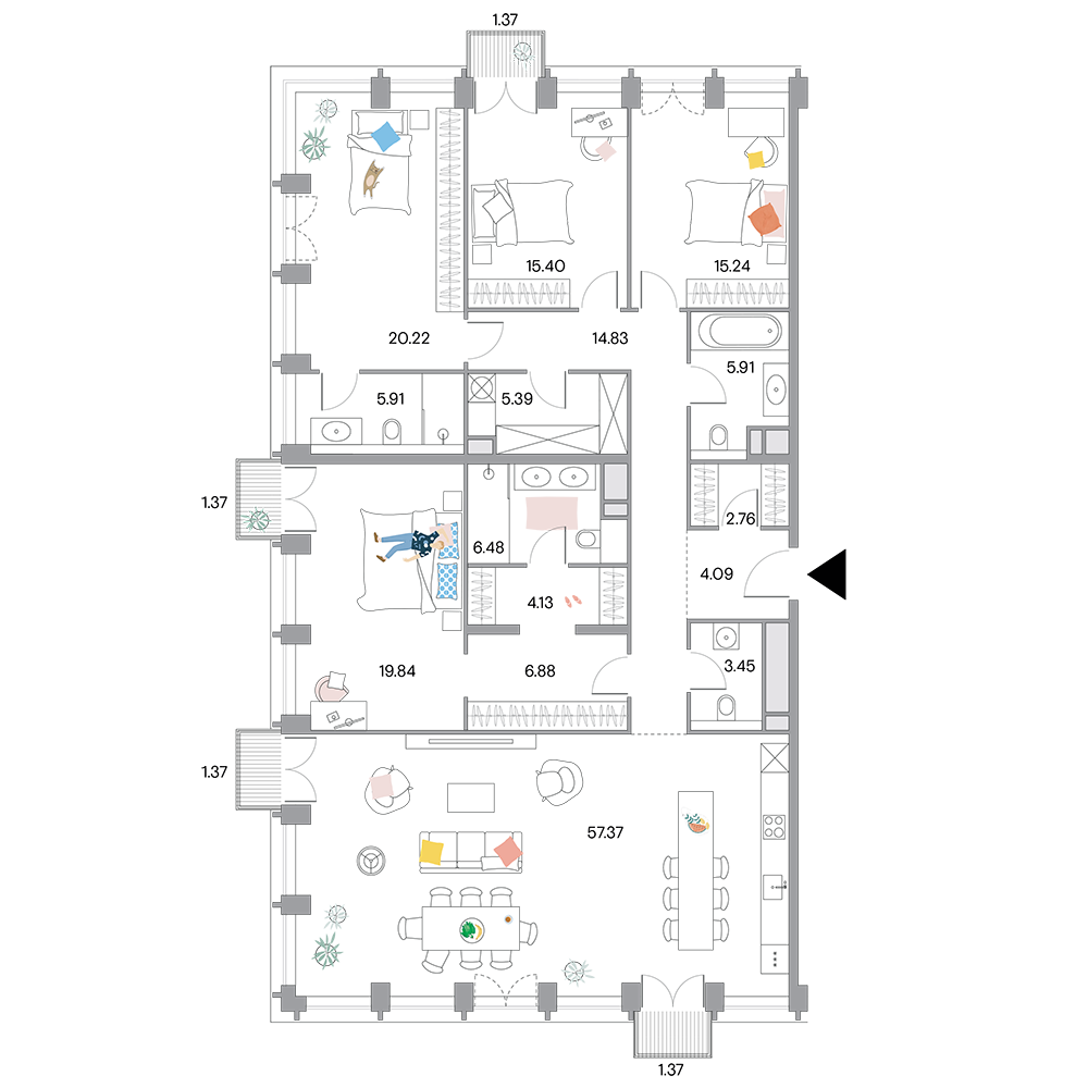 Пример планировки квартиры с 3-мя спальнями и террасой