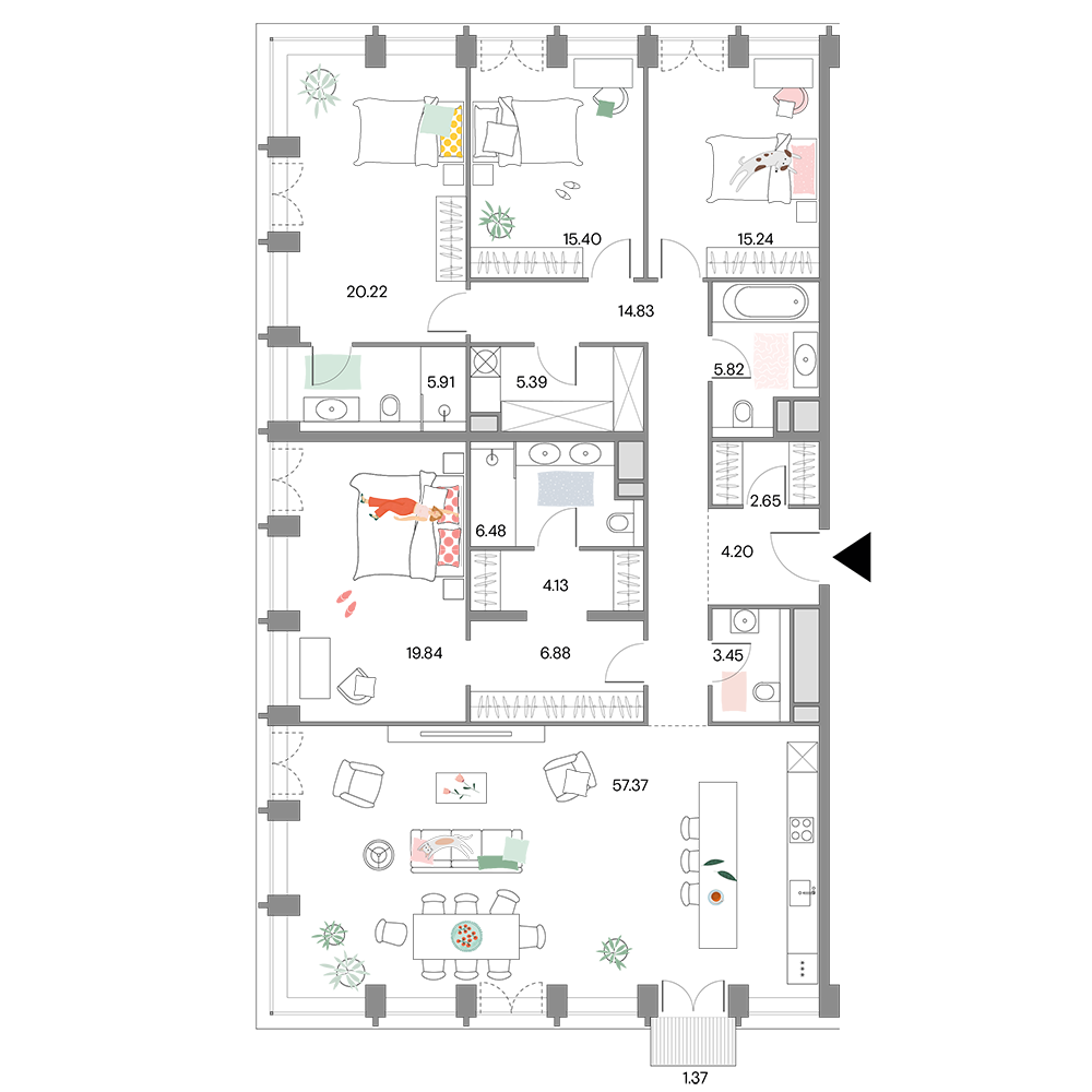 Пример планировки квартиры с 3-мя спальнями и террасой