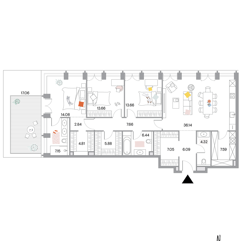 Пример планировки квартиры с 3-мя спальнями и террасой