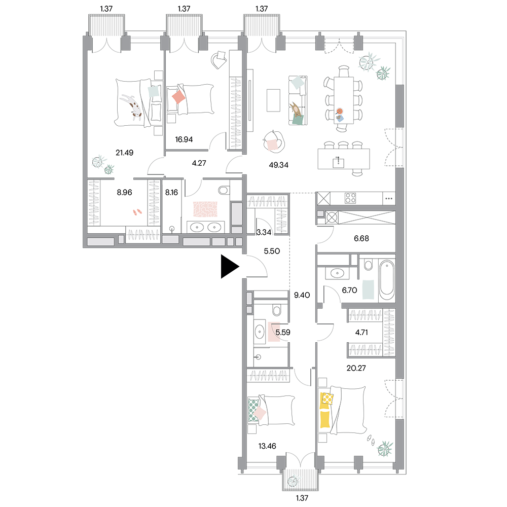 Пример планировки квартиры с 3-мя спальнями и террасой