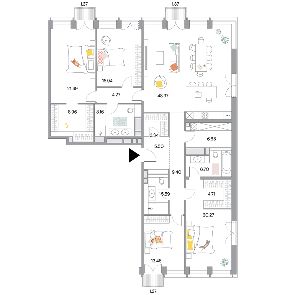 Пример планировки квартиры с 3-мя спальнями и террасой